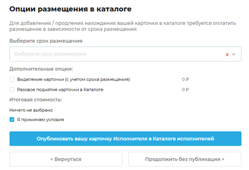 При желании указать дополнительные платные опции. После этого будет рассчитана стоимость публикации. - Затем ставим галочку напротив «Я принимаю условия» и кликаем на кнопку «Опубликовать вашу карточку Исполнителя в Каталоге Исполнителей». Или можно «Продолжить без публикации», если вы по каким-то причинам не хотите видеть свою карточку в каталоге исполнителей. Это не помешает вам откликаться на задания. А оказаться в каталоге исполнителей вы сможете и позже, перейдя по кнопке «Расширить возможности профиля» в личном кабинете.