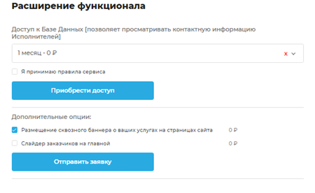 2. Теперь вы можете оформлять платные опции. Для этого перейдите из личного кабинета по ссылке «Расширить возможности профиля». Появится форма расширения функционала. Для исполнителя, заказчика и агентства в ней будут доступны разные услуги.
