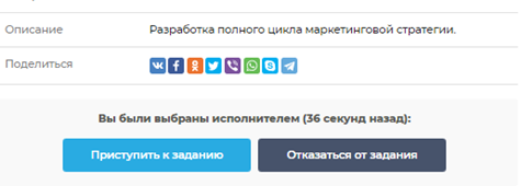 Исполнитель, чье предложение одобрили, может или приступить к заданию, кликнув на соответствующую кнопку, или отказаться от задания (также пройдя по одноименной ссылке).