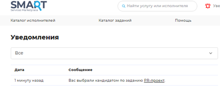 Заявителю придет оповещение, что он выбран кандидатом на задание или же его заявка отклонена.