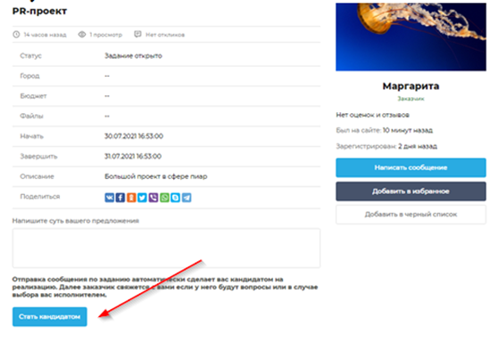 После того как задание появляется в общем каталоге, откликнуться на него может каждый исполнитель или любое агентство. Исключение – пользователи, которые занесены автором задания в черный список. Количество откликов на предложение не ограничено.