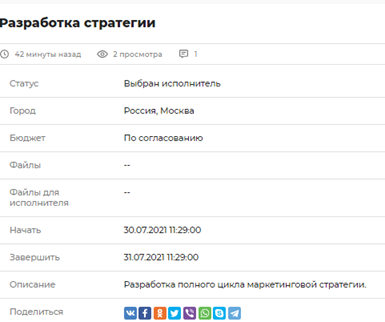 Если исполнитель-кандидат подтверждает запрос, сделка считается заключенной. Задание теперь все участники сделки видят со статусом «Выбран исполнитель».