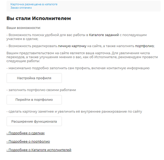При желании указать дополнительные платные опции. После этого будет рассчитана стоимость публикации. - Затем ставим галочку напротив «Я принимаю условия» и кликаем на кнопку «Опубликовать вашу карточку Исполнителя в Каталоге Исполнителей». Или можно «Продолжить без публикации», если вы по каким-то причинам не хотите видеть свою карточку в каталоге исполнителей. Это не помешает вам откликаться на задания. А оказаться в каталоге исполнителей вы сможете и позже, перейдя по кнопке «Расширить возможности профиля» в личном кабинете.