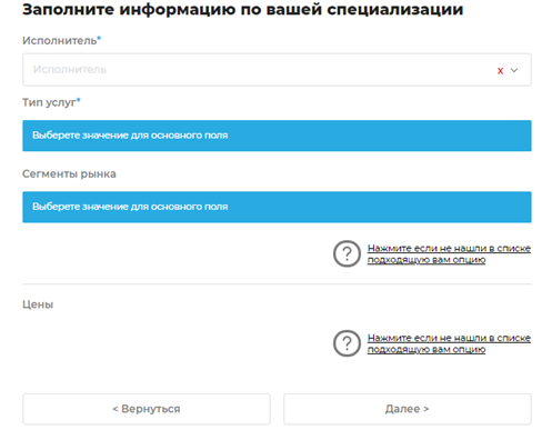 - Указать специализацию исполнителя – выбрать один из имеющихся в списке вариантов.
