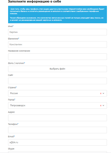 - В двух разных графах кратко (до 200 символов) и подробно (до 1000 символов) описать свою деятельность.