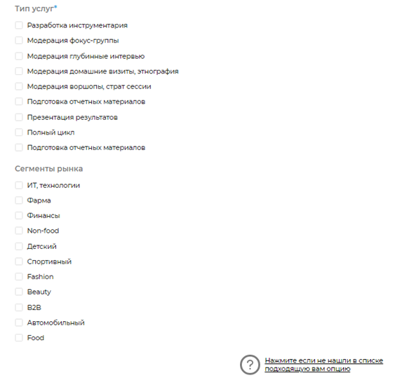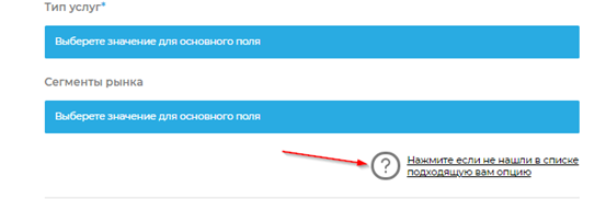 Если мы посчитаем, что дополнение не избыточно, логично и не дублирует уже имеющуюся строку, то добавим его в список в ближайшее время. Пока просто выберите максимально близкий вариант. Изменить его вы сможете в любой момент. - Выбрать тип услуг, указать сегменты рынка. Можно выбирать несколько пунктов.
